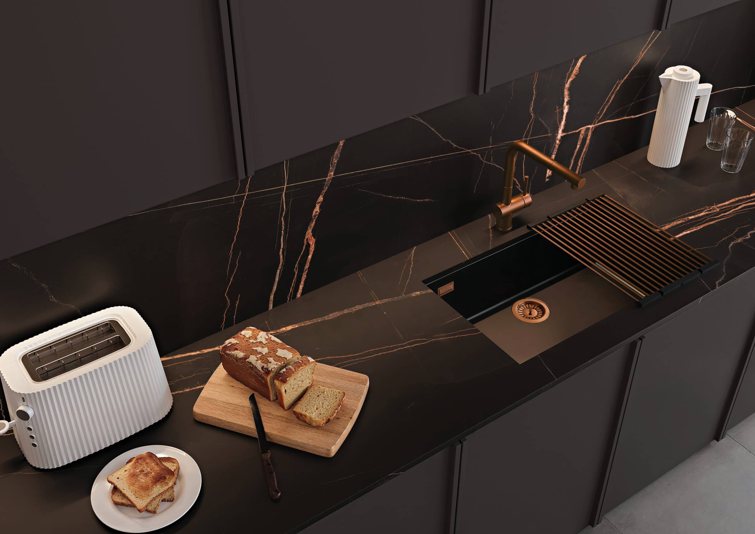 microULTRAGRANIT 拥有超过 80% 的石英和花岗岩微粒,具有非凡的美学特性、舒适的手感和卓越的耐划痕、耐化学腐蚀和耐热性能。