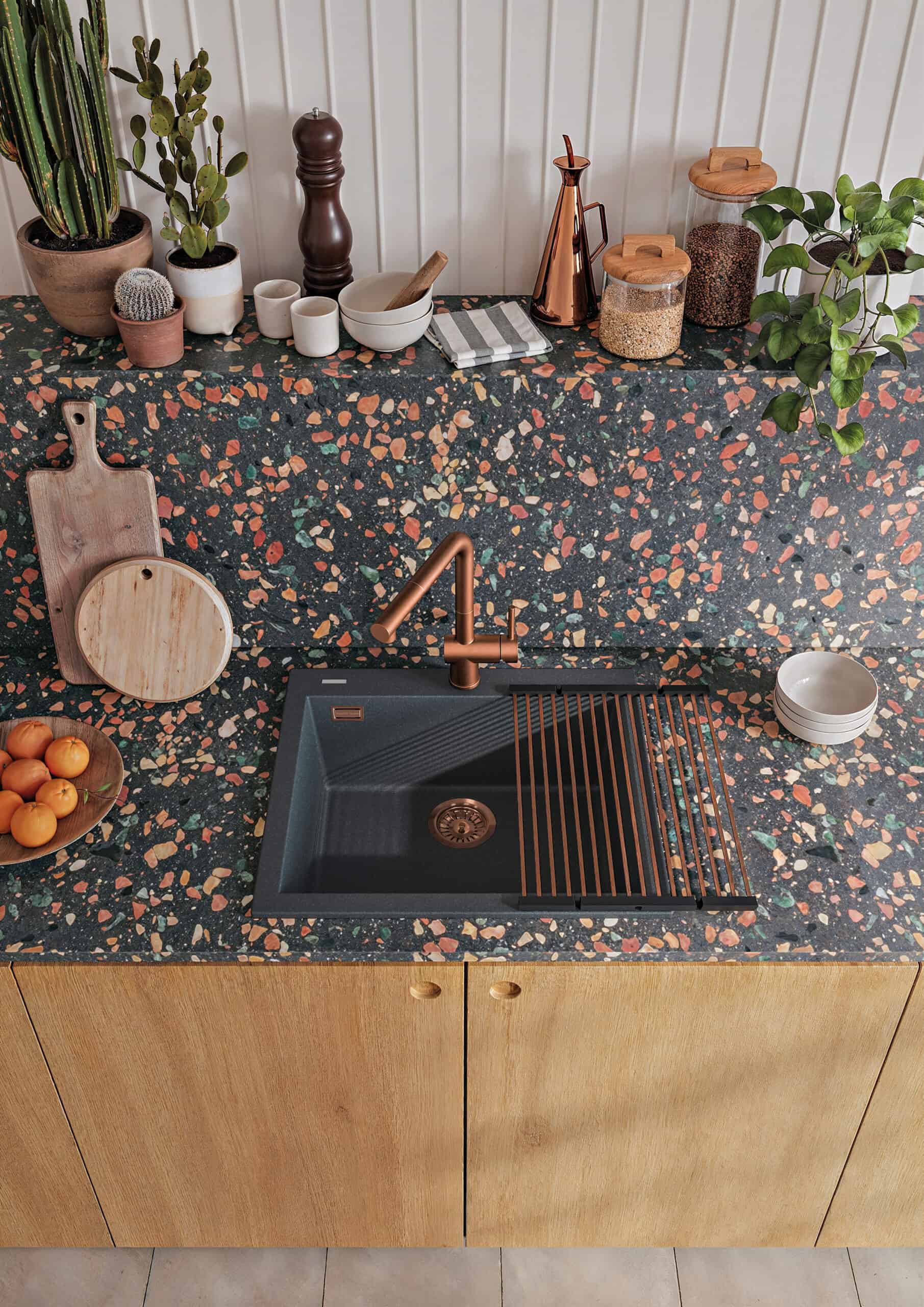金属颗粒、石英和花岗岩赋予水槽金属色调,与现代环境和不锈钢完美搭配。易于清洁、卫生、耐划痕、耐化学品和高温。