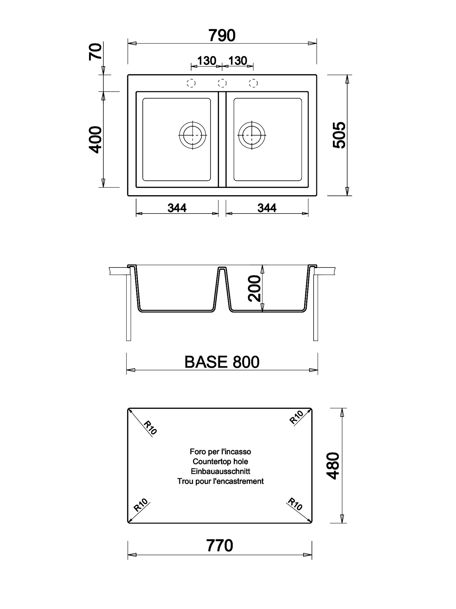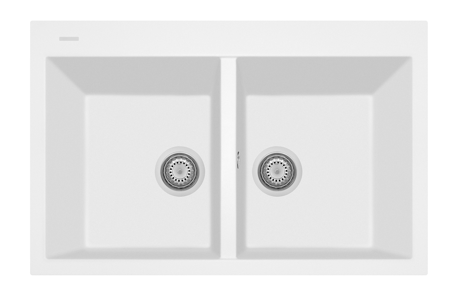 790×505毫米 - 双槽水槽,有预钻孔,用于安装one水龙头和配件。