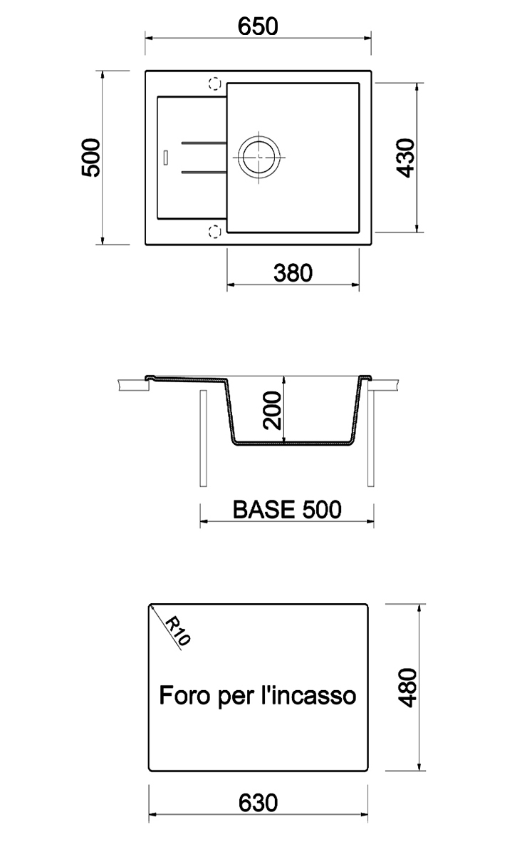 650×500毫米--单槽水槽加滴水盘,可翻转,有预钻孔,可安装one水龙头和配件。