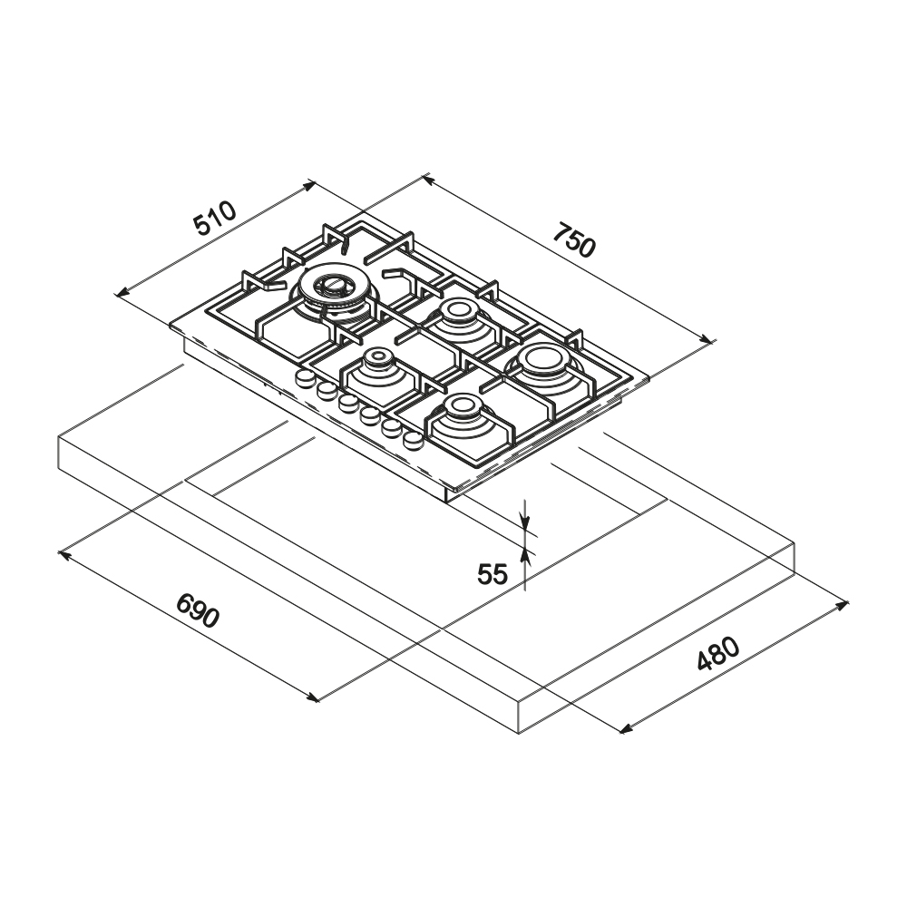 75 厘米炉灶,配有 5 个燃气灶,包括 1 个三联灶。