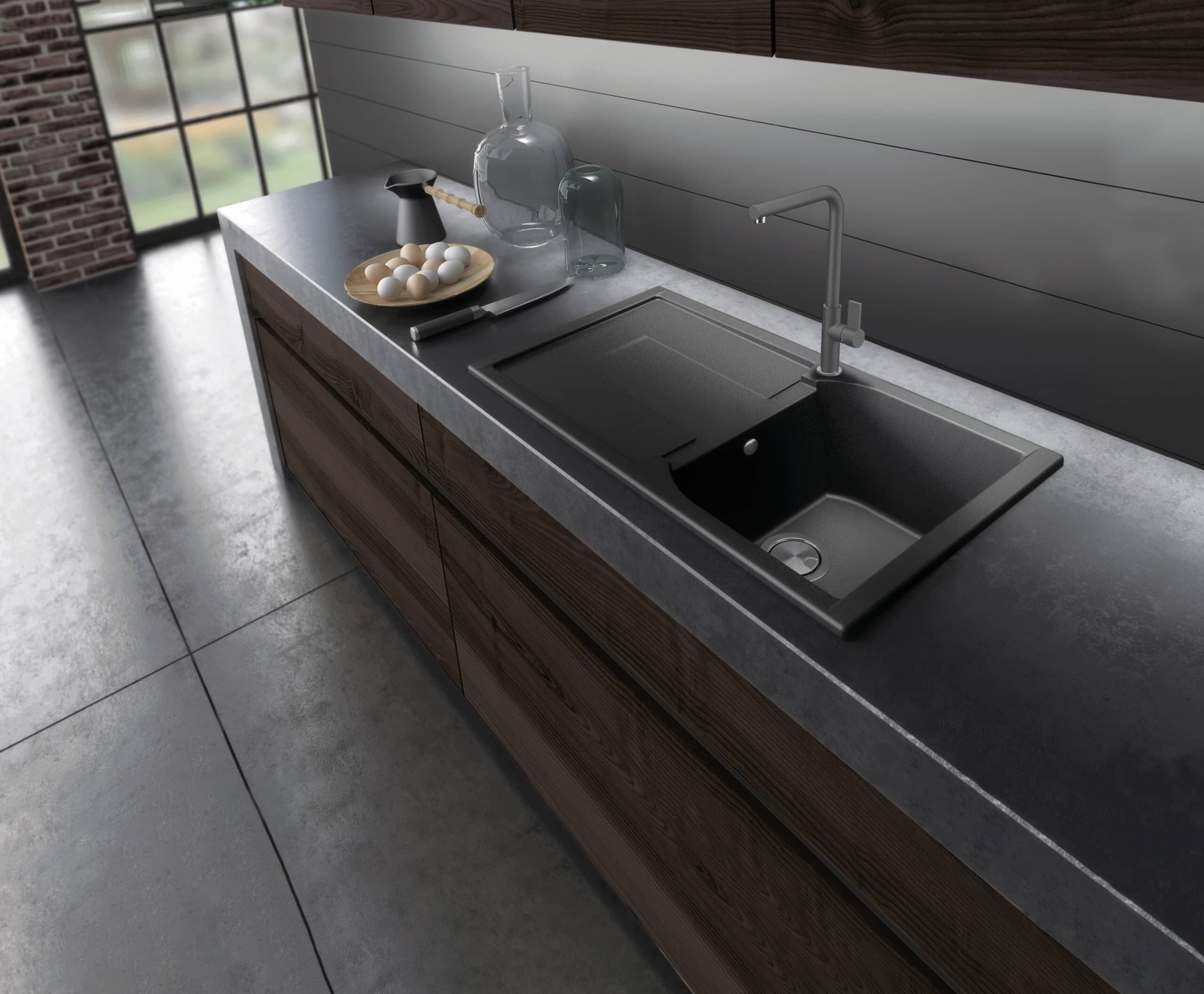 金属颗粒、石英和花岗岩赋予水槽金属色调,与现代环境和不锈钢完美搭配。易于清洁、卫生、耐划痕、耐化学品和高温。