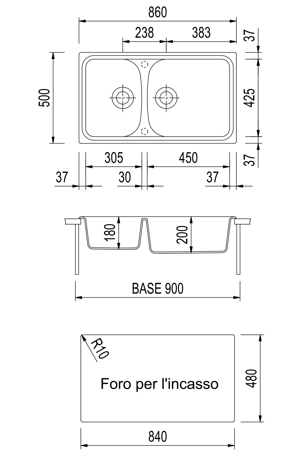 860×500毫米 - 双槽水槽,可翻转,有预钻孔,可安装one水龙头和配件。