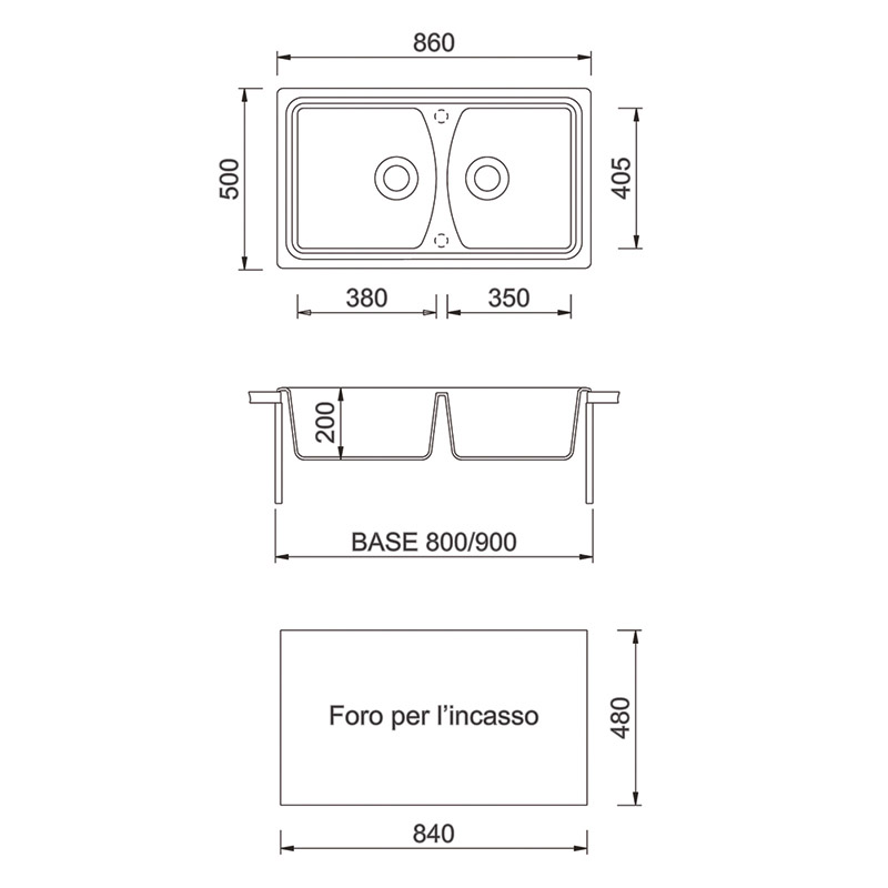 860×500毫米 - 双槽水槽,可翻转,有预钻孔,可安装one水龙头和配件。