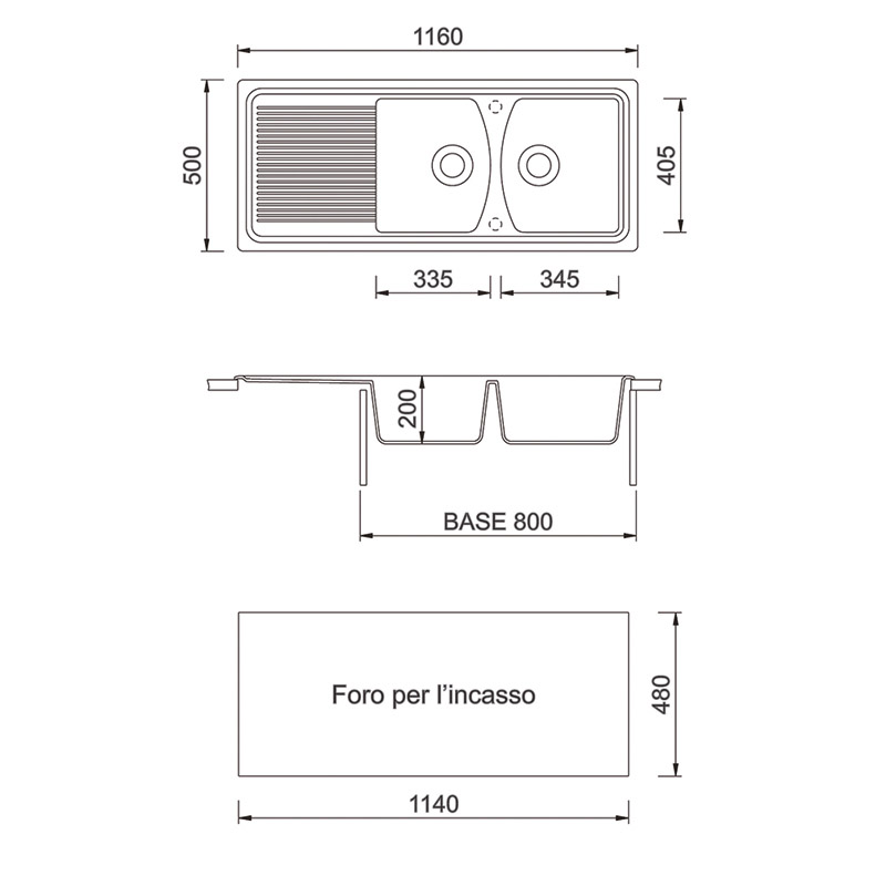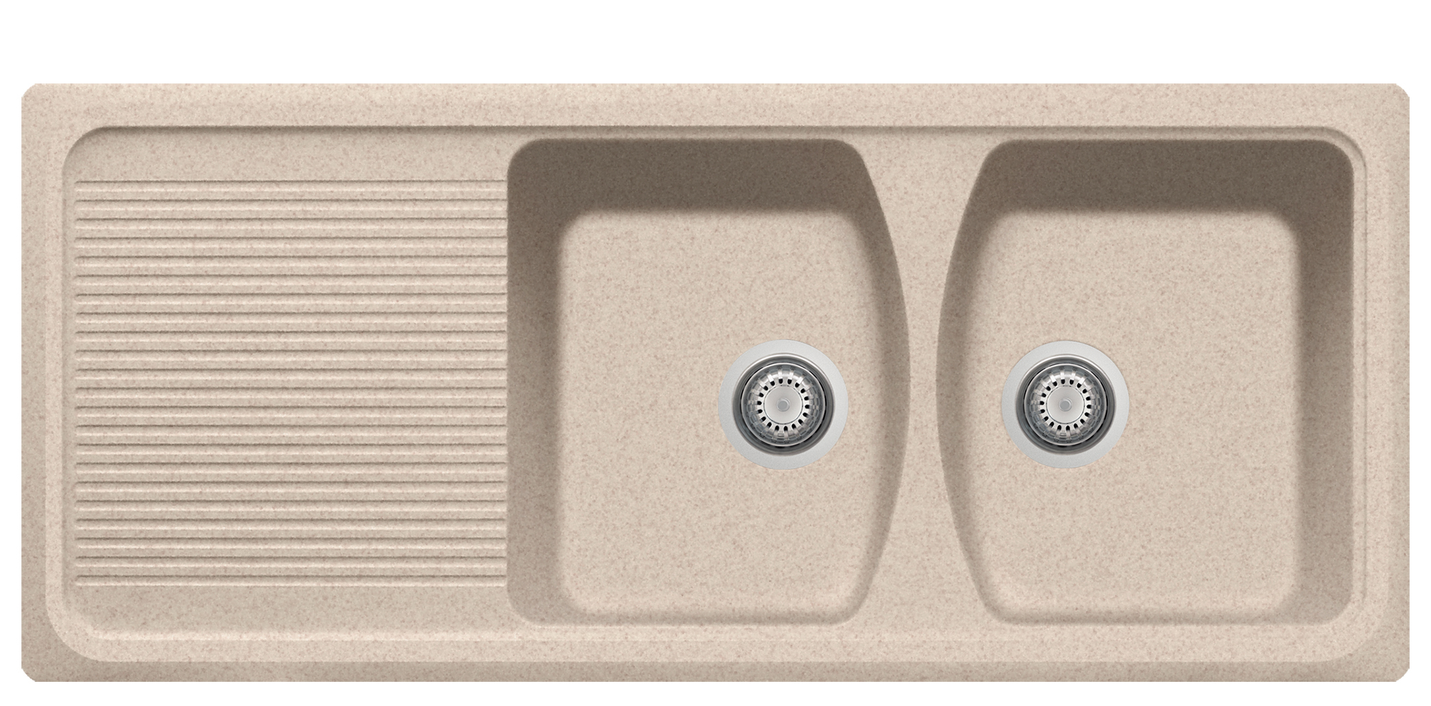 1160×500毫米 - 双槽水槽加滴水盘,可翻转,有预钻孔,可安装one水龙头和配件。