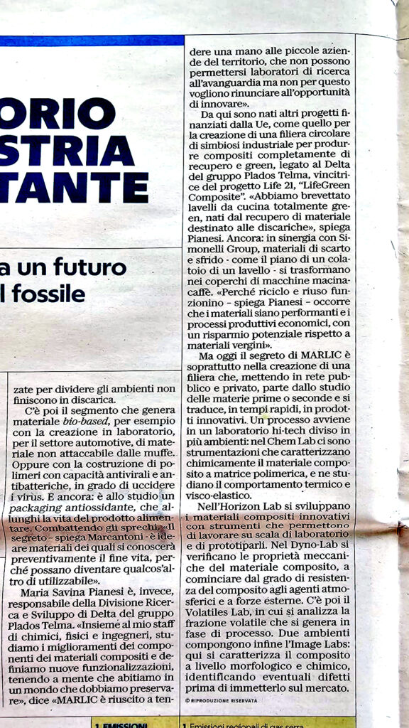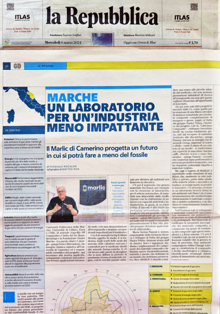 Repubblica 报》的绿色和蓝色插页上刊登了一篇题为 "MARLIC LIFE GREEN COMPOSITE "的文章(6/03/24)。