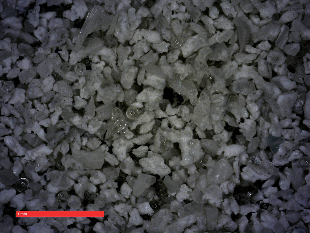 我们新启动的 frazione r-quartz r-quartz 系统研磨出的乳白色水槽的第一张电子显微镜照片。图片:0.1 毫米 frazione r-quartz 白色的显微照片