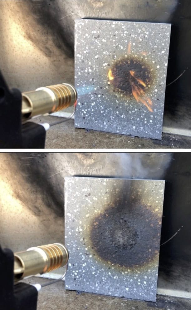 初步测试显示,回收的复合材料具有良好的防火性能潜力。第一块Campione GREEN 1号板在向10厘米距离的丙烷火焰输送one 2分钟后,没有显示出滴落、没有后燃one和穿孔one。