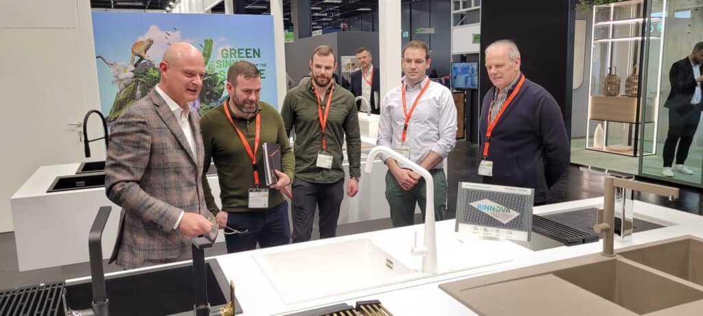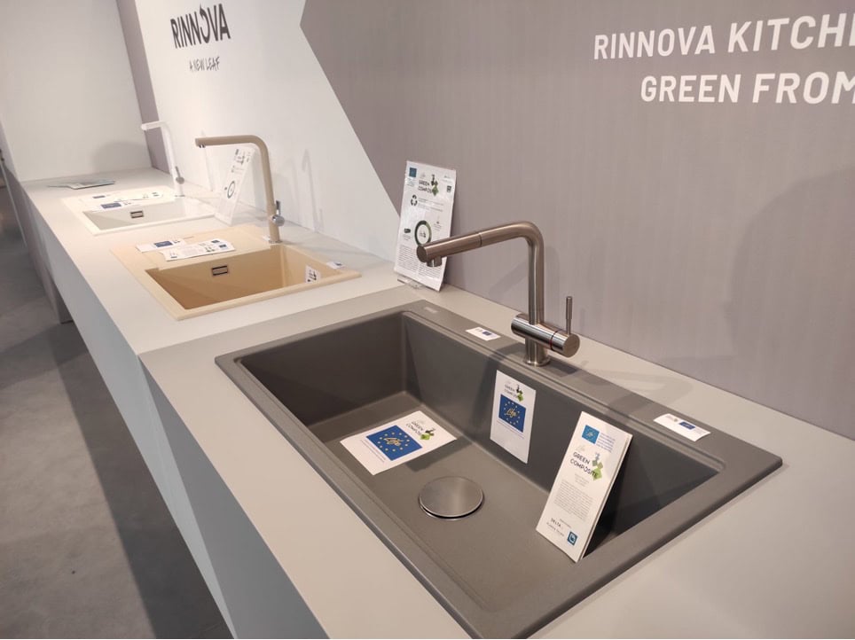 LIFE GREEN COMPOSITE 团队利用 one 的机会,向市场和客户展示了 100% 绿色水槽的第一款原型产品,颜色为白色,虽然在美观上还不够完美,但它是由从树脂到矿物填料的可回收原材料制成的。该原型是在模塑试验期间生产的水槽之一,试验结果表明该颜色的水槽效果最佳。在接下来的几周和几个月里,项目团队将重点生产 one 更多颜色的水槽,并完善白色水槽。展台上的参观者对回收材料制成的水槽的质量以及在寻找过程中遇到的困难非常感兴趣。他们还问 forma 到除了白色水槽之外还有哪些颜色,并好奇地询问成本是否会比用原生材料制造的水槽高出很多。