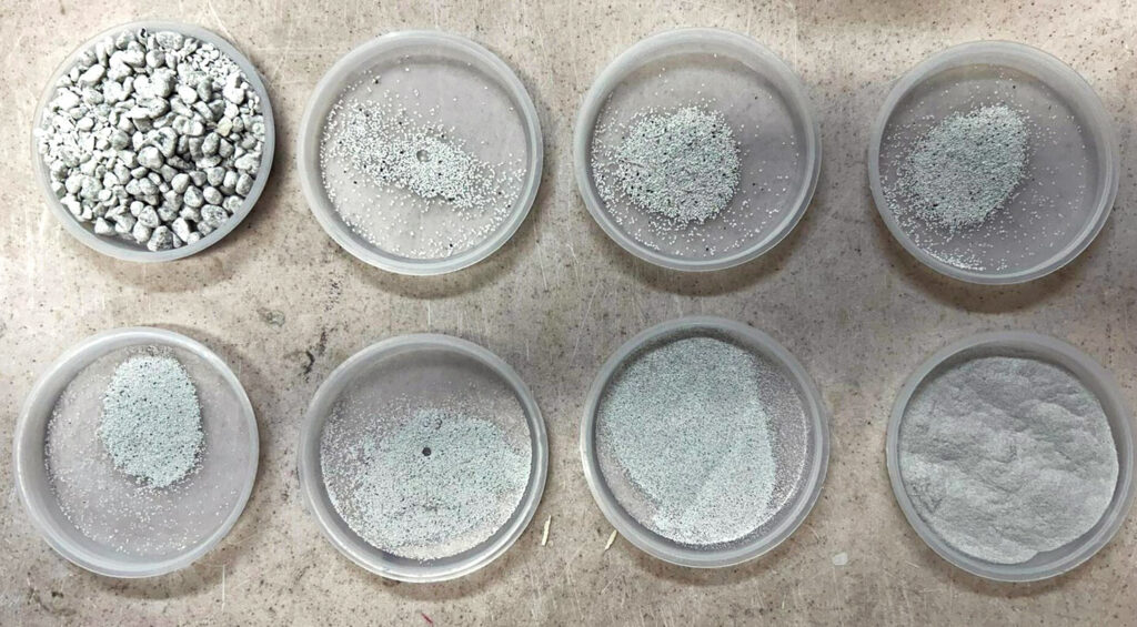 在我们的新型研磨系统 one 中对来自白色水槽的 one 废料和废渣进行首次研磨测试。图片:不同粒度的 Fieldsone r-quartz 白色 Delta