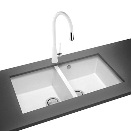 Plados-Telma 水槽的两侧都有预打孔(图 A),您可以选择混合龙头和配件的位置。