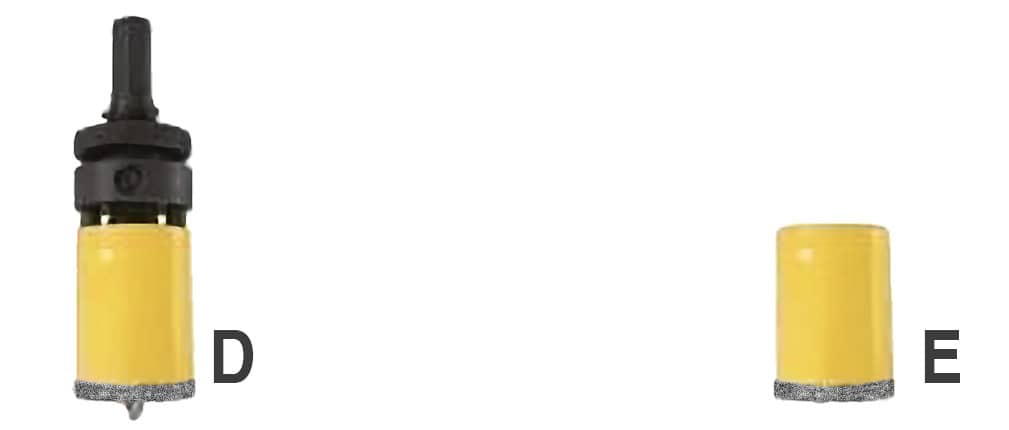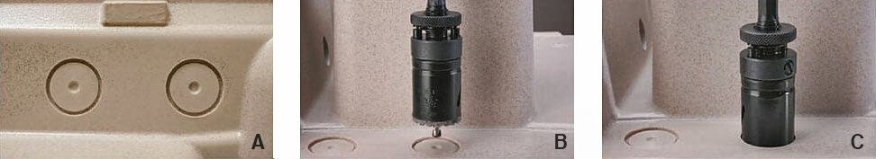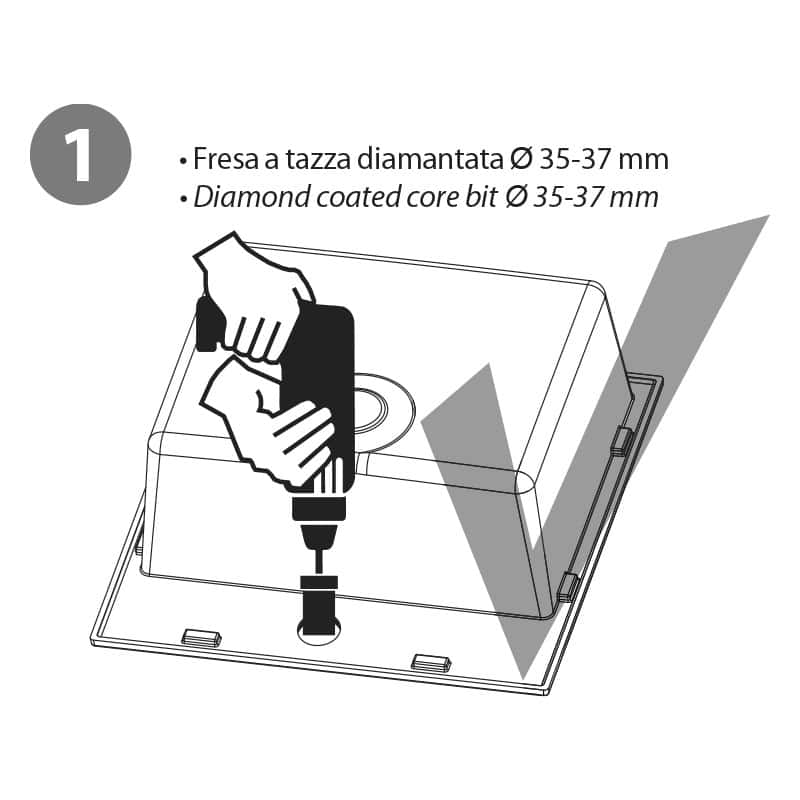 注意!为了避免对水槽可能造成的损坏,建议使用35-37毫米的金刚石钻头按照图片B和C所示的程序钻这些孔。根据要求,Plados-Telma公司提供完整的钻孔套件(代码KITFRESA-图片D),包括