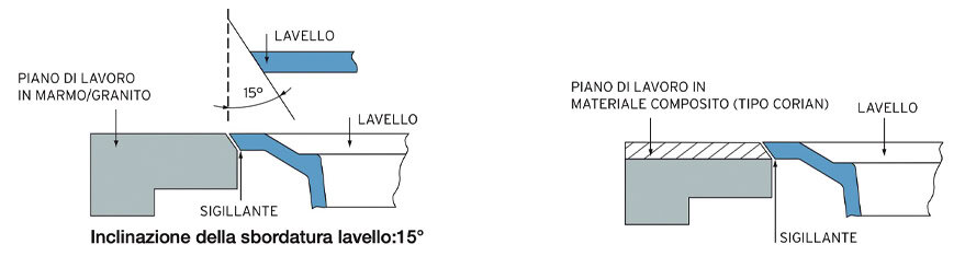 根据要求,ONE/CUBE和ELEGANCE/AMANDA系列的水槽可以提供嵌入式安装。图片显示了水槽整个周边的处理,以获得倾斜的角度为15°。