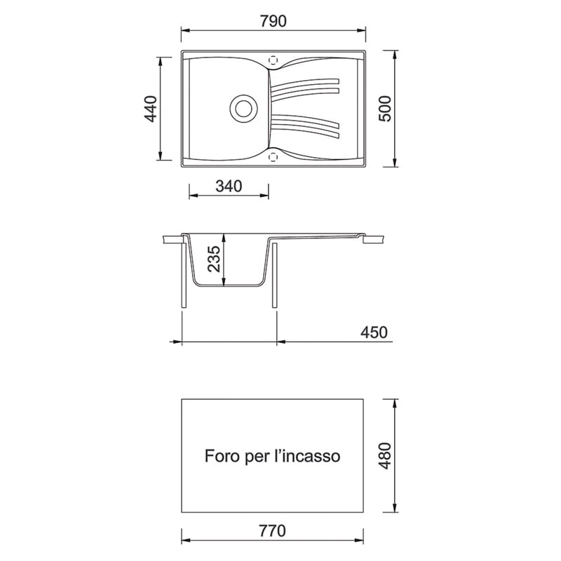 790×510毫米--单槽水槽加滴水盘,可翻转,有预钻孔,可安装one水龙头和配件。