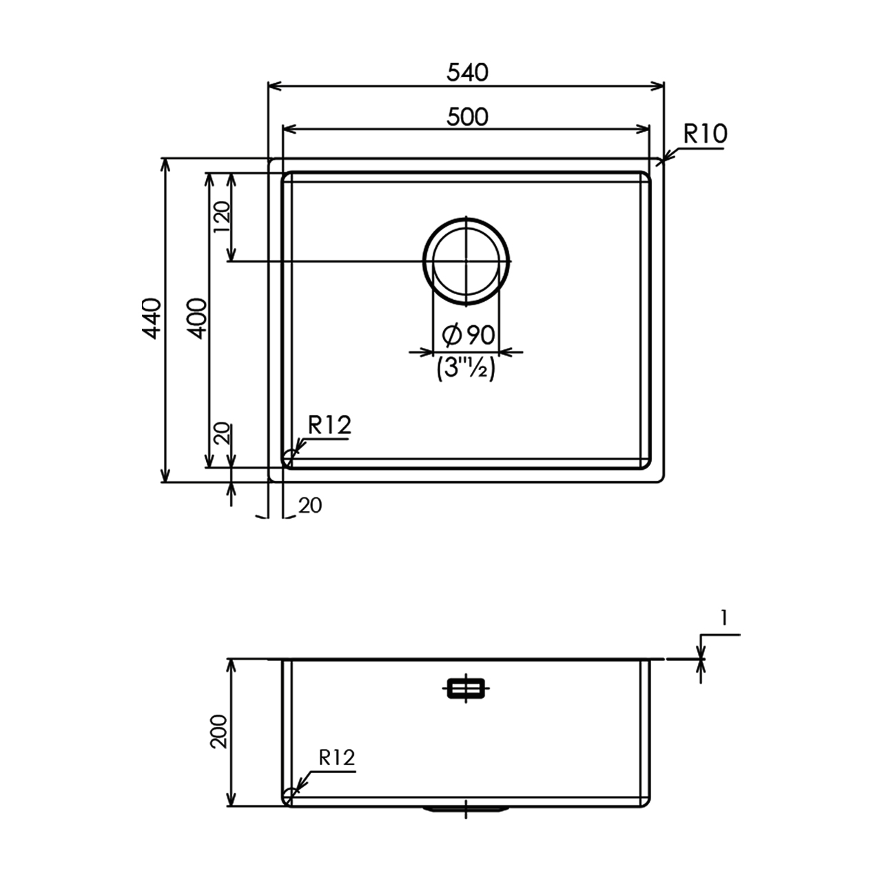 540×440毫米 - 单槽水槽,不锈钢,用于台下安装one