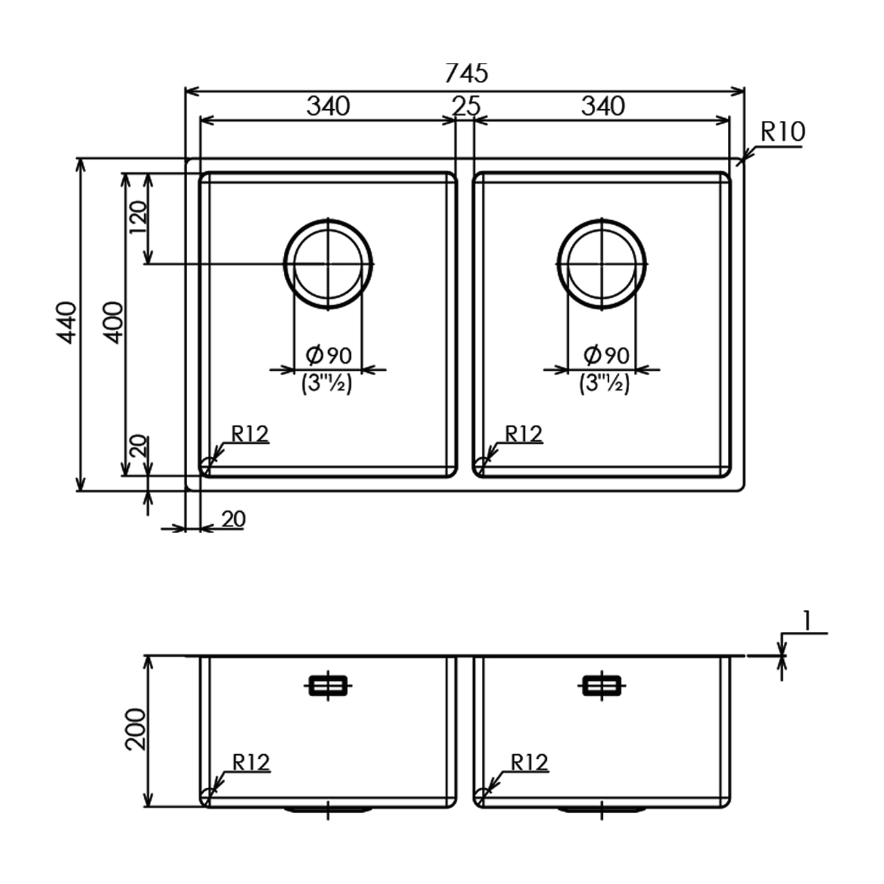 745×440毫米 - 双槽水槽,不锈钢,用于顶下安装one
