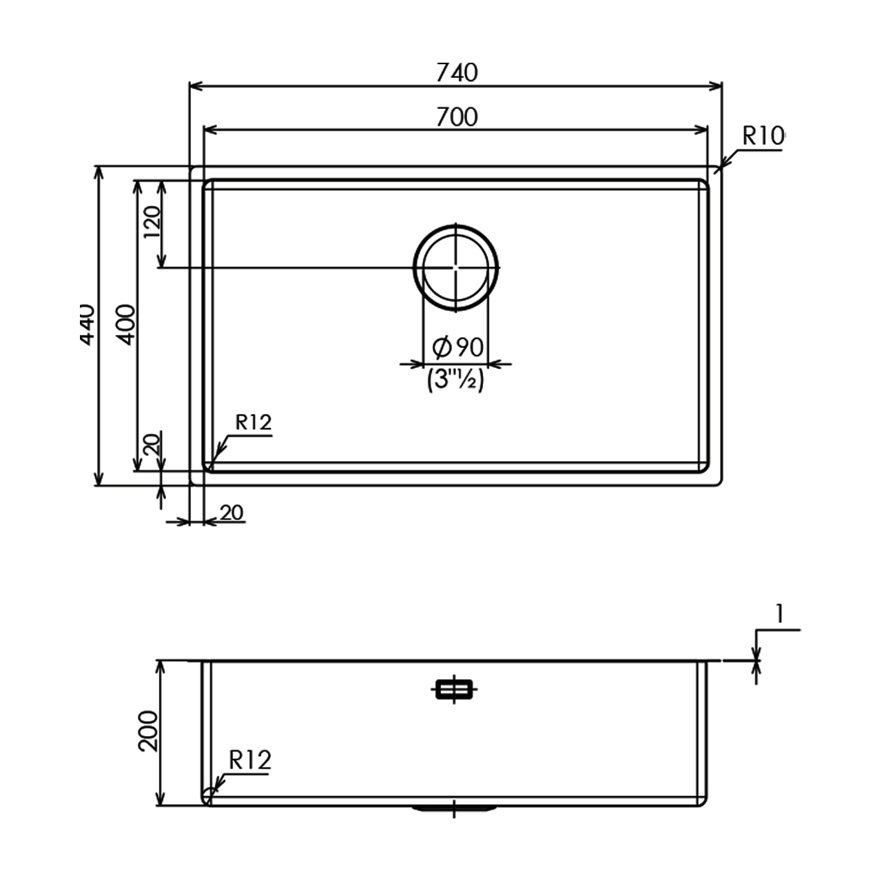 740×440毫米 - 单槽水槽,不锈钢,用于安装one slim/filo-top
