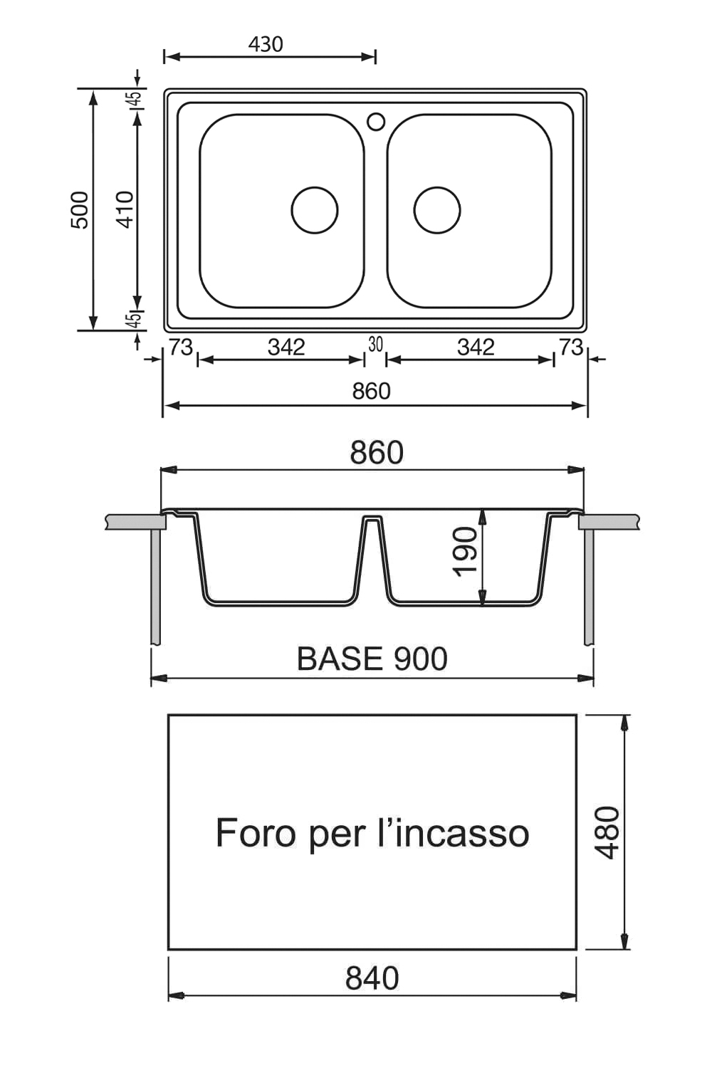 860×500毫米 - 两碗水槽。