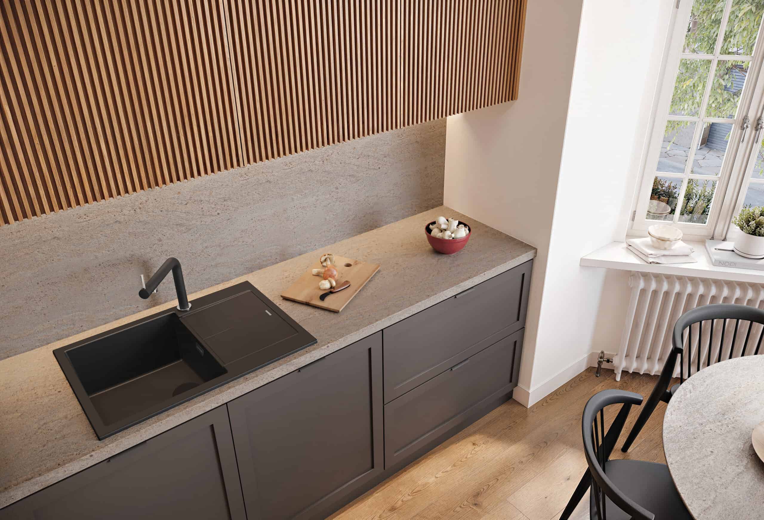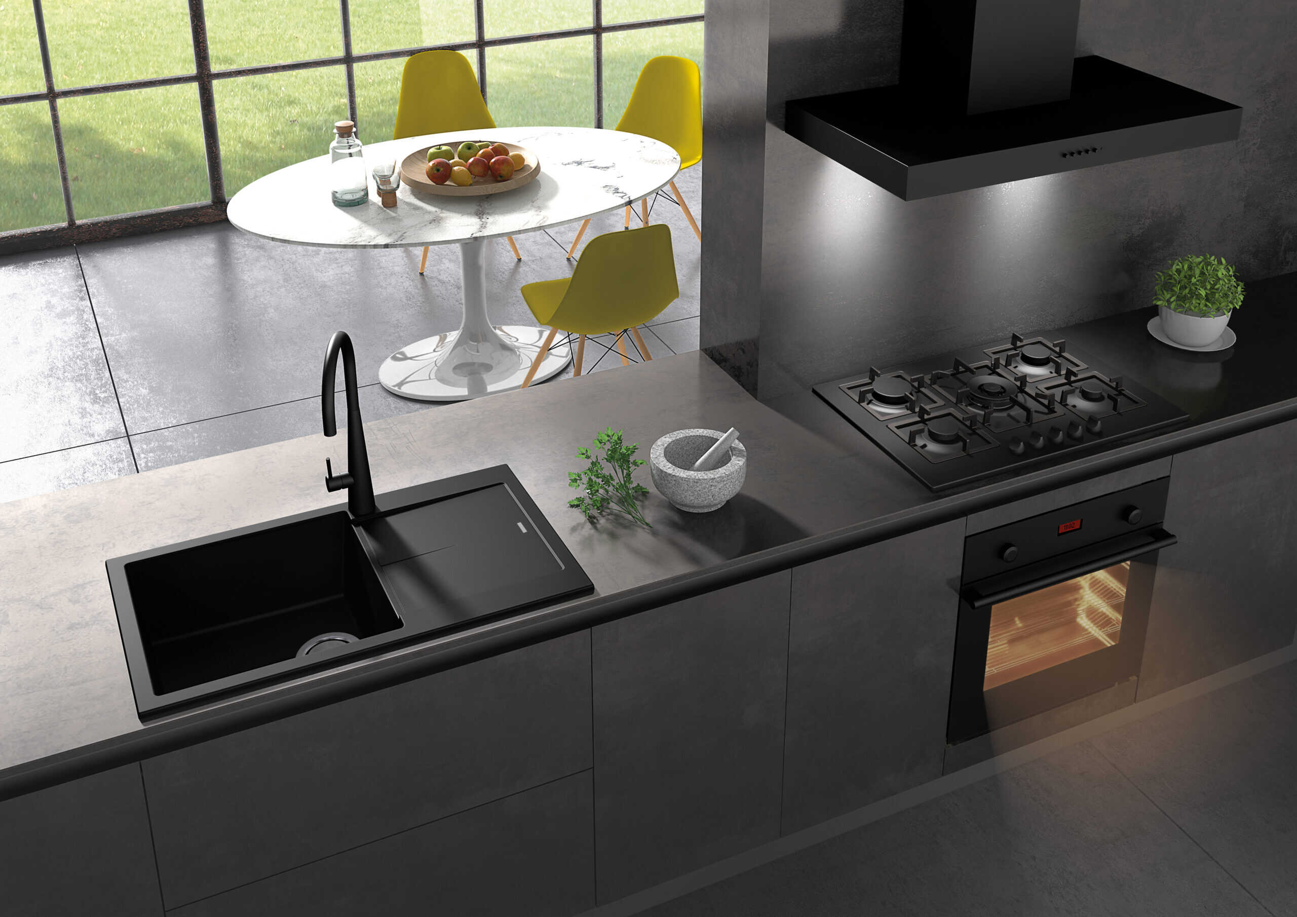 金属颗粒、石英和花岗岩赋予水槽金属色调,与现代环境和不锈钢完美搭配。易于清洁、卫生、耐划痕、耐化学品和高温。